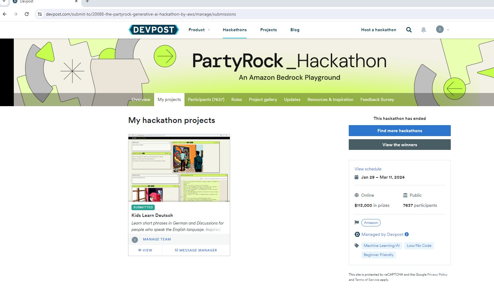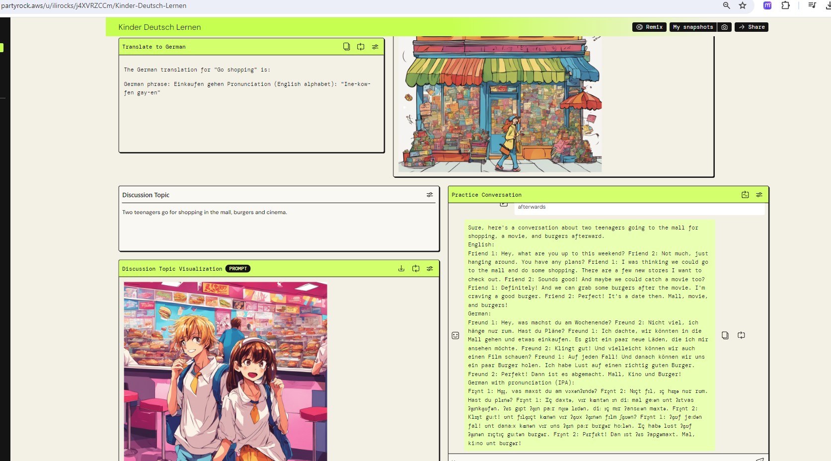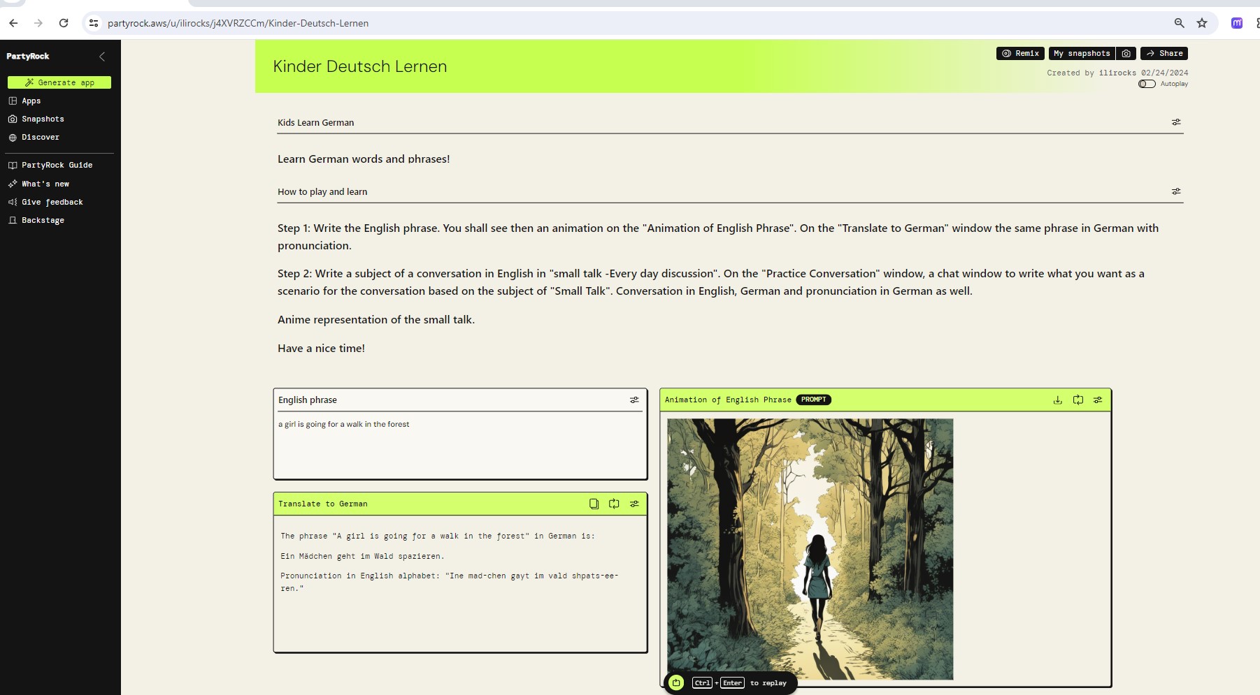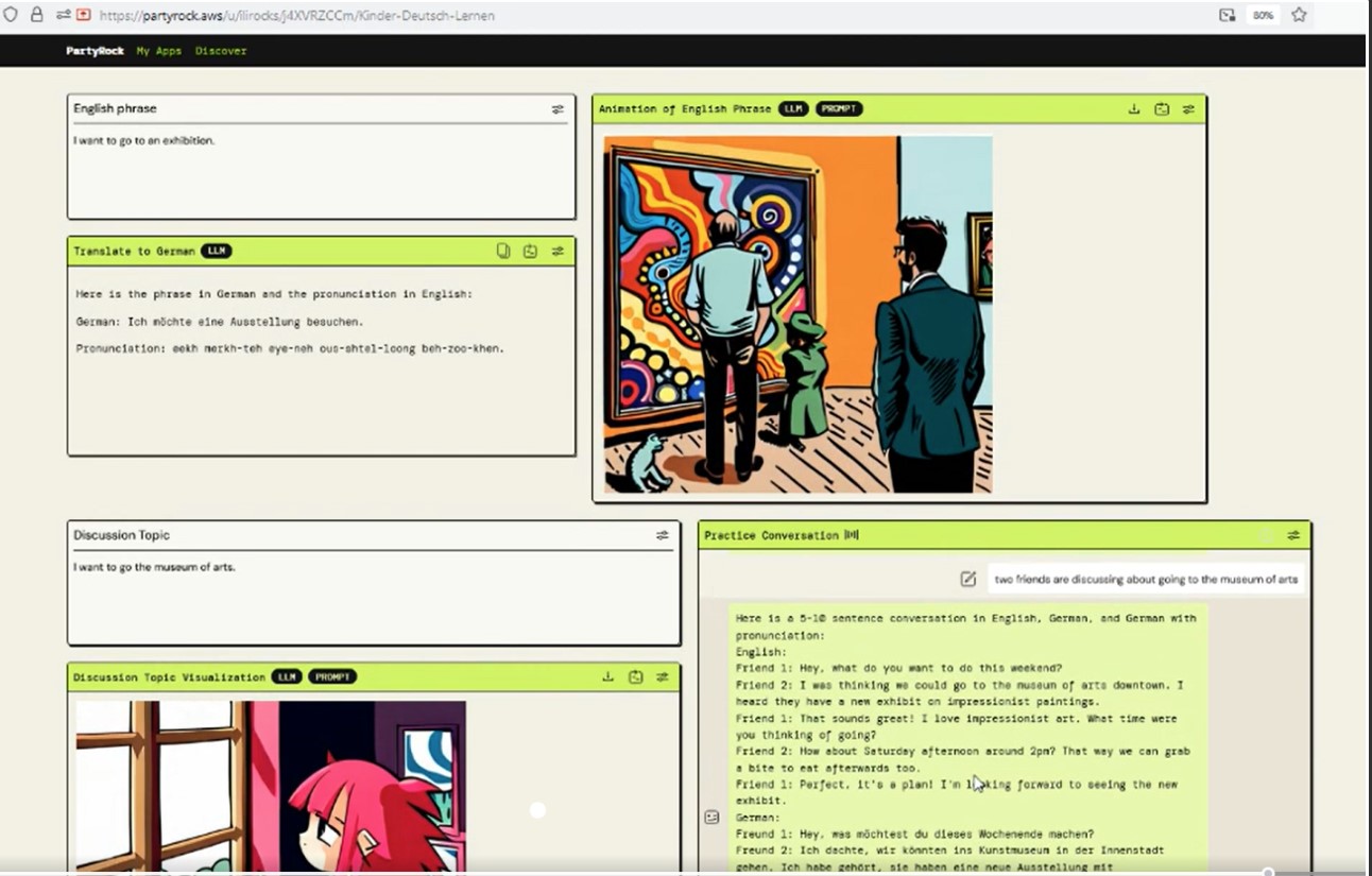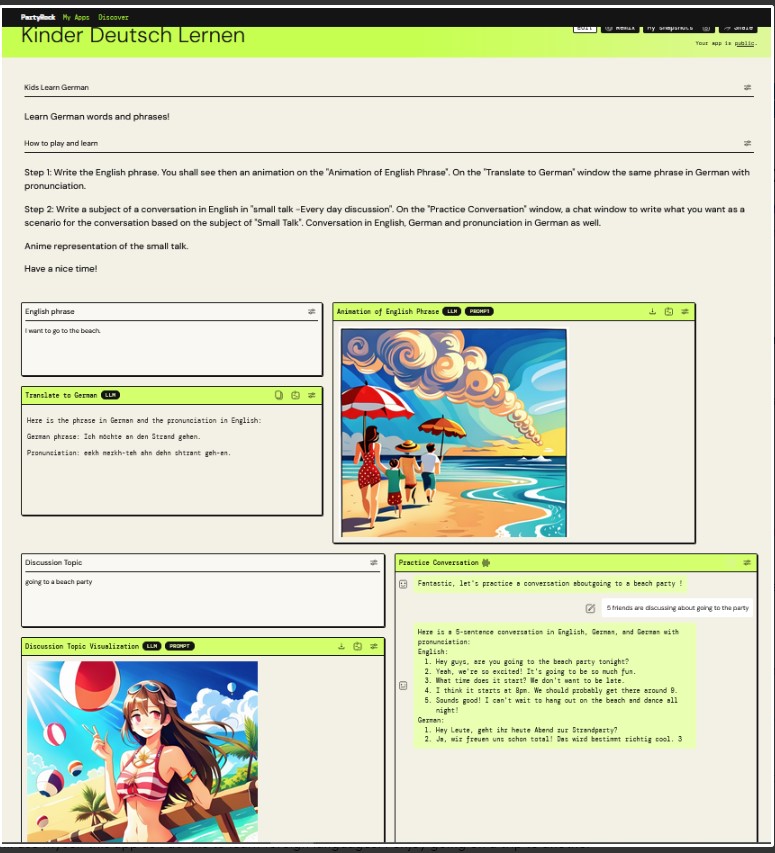 Couple of months ago I was inspired with AWS PartyRock Hackathon and I participated. I started this Interactive Learning app for kids from 8 and up (us too!) to learn German words, phrases and basic discussions.