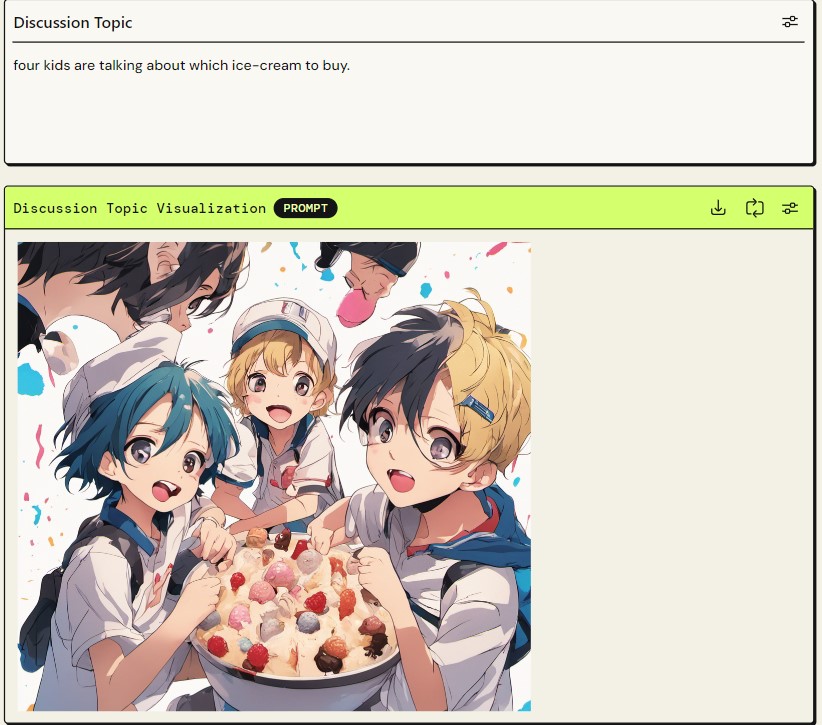 English Phrase and Discussion Topic are simple UserInput Widgets Animation of English Phrase: Stable Diffusion XL Animation Widget with Style Comic Book Discussion Topic Visualization: Anime Style of Stable Diffusion XL Animation Widget Translate to German: Claude widget with prompt: translate [English phrase] in German writing down both the phrase in German and pronunciation in English alphabet. Practice Conversation: Claude widget with prompt : Hello, I would like to practice a conversation about [Discussion Topic] .Could you provide the conversation of 5-10 sentences first in English then the same conversation in German and lastly the same conversation with the pronunciation in German.