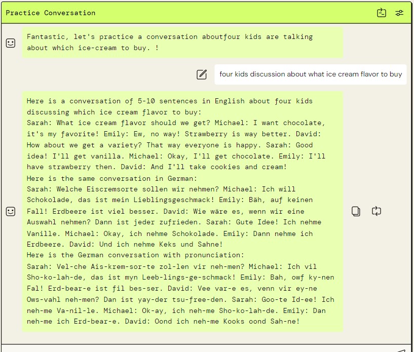 In the “Translate to German”, the English phrase is translated in German and shows also the pronunciation. The animation of English phrase is a visual representation of the English phrase ( always an image is capturing and I love it of course)! “Discussion Topic” is a phrase or maybe just a topic that you want to discuss about and learn how a real discussion would sound like in German with this topic. “Practice Conversation” is where actually the chat referring to the topic “Discussion Topic” begins. You write down a scenario for the specific topic e.g. if topic is ice cream, then you ask the chat: 2 kids wondering if they should buy chocolate or strawberry ice-cream. The response is 5-10 sentences, in the chat which will be shown in English then in German along with the pronunciation. “Discussion Topic Visualization” is anime representation of the “Discussion topic”.